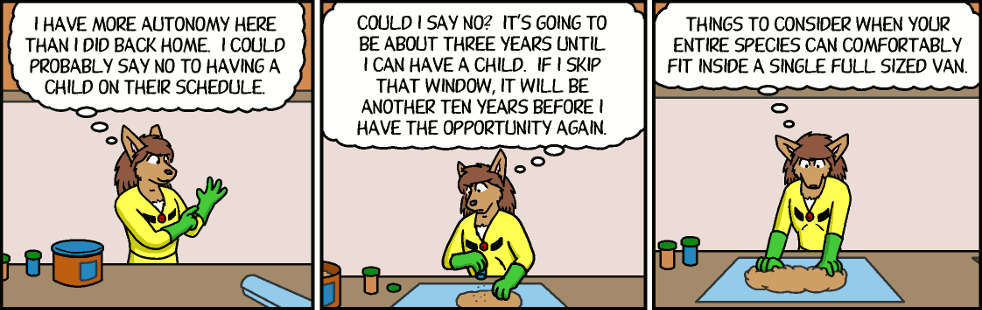 Florence (thinking): I have more autonomy here than I did back home. I could probably say no to having a child on their schedule.